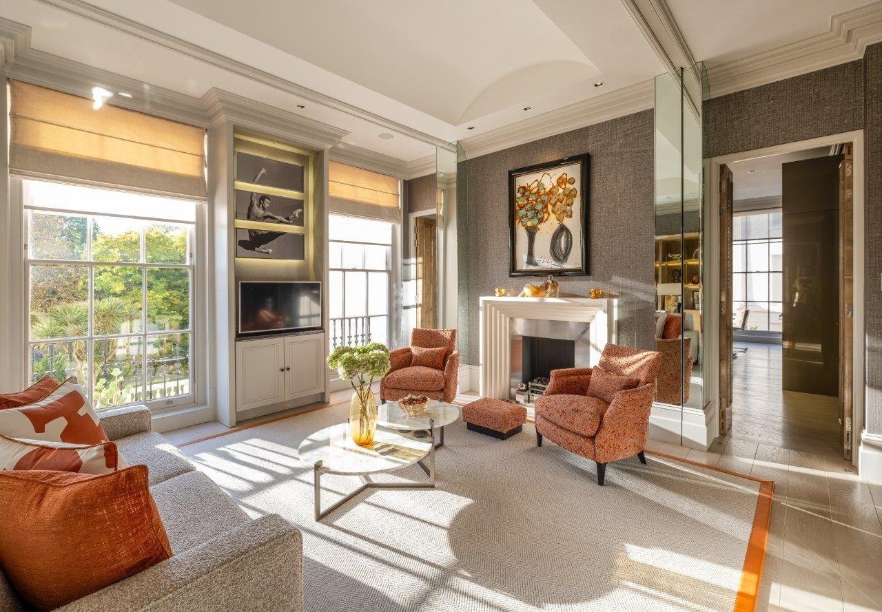 The accommodation comprises a welcoming entrance hall, a spacious drawing room with double French doors opening onto a juliette balcony overlooking Regent’s Park, and a separate dining room ideal for formal entertaining. The kitchen/ breakfast room is generously proportioned and well-appointed.