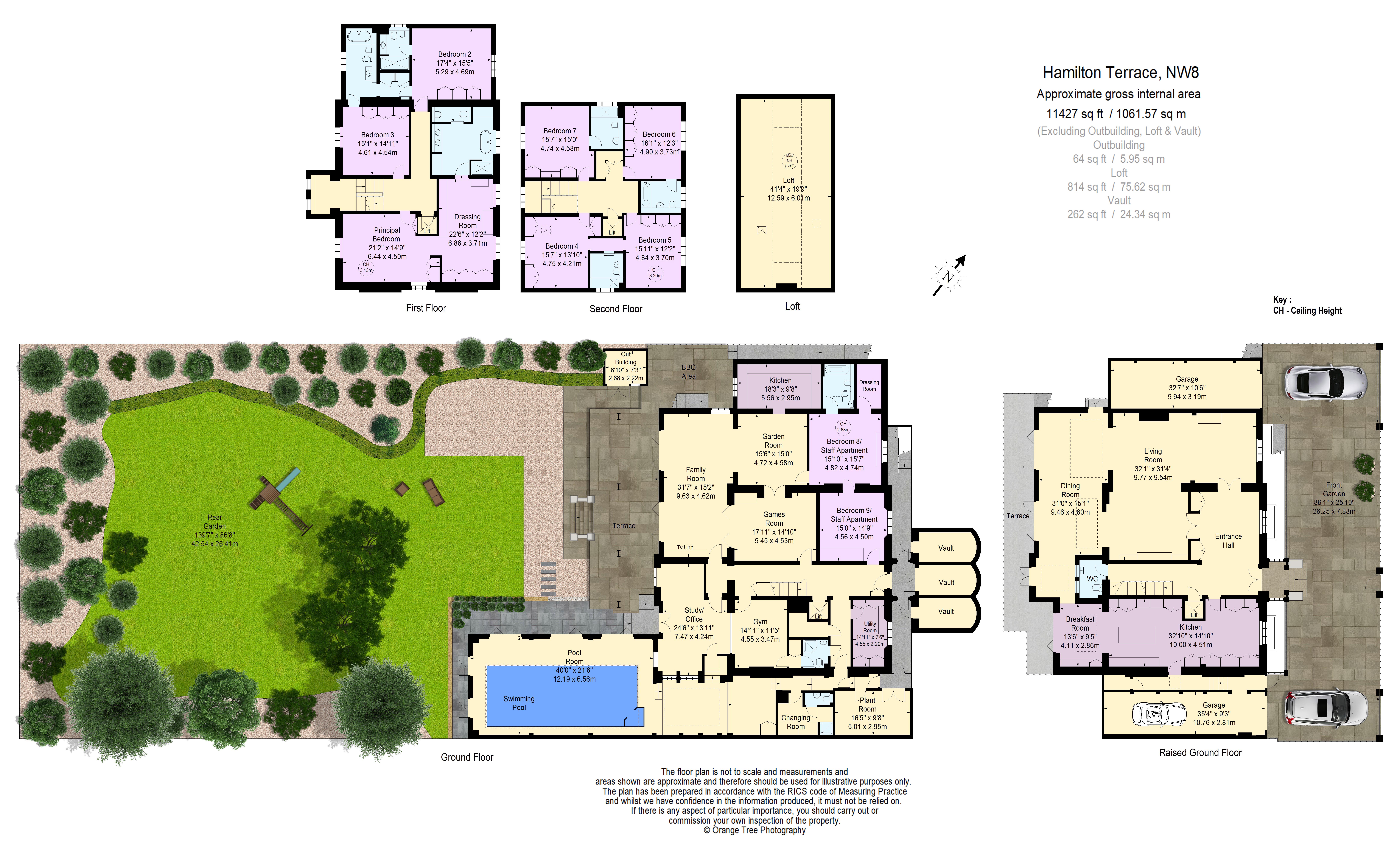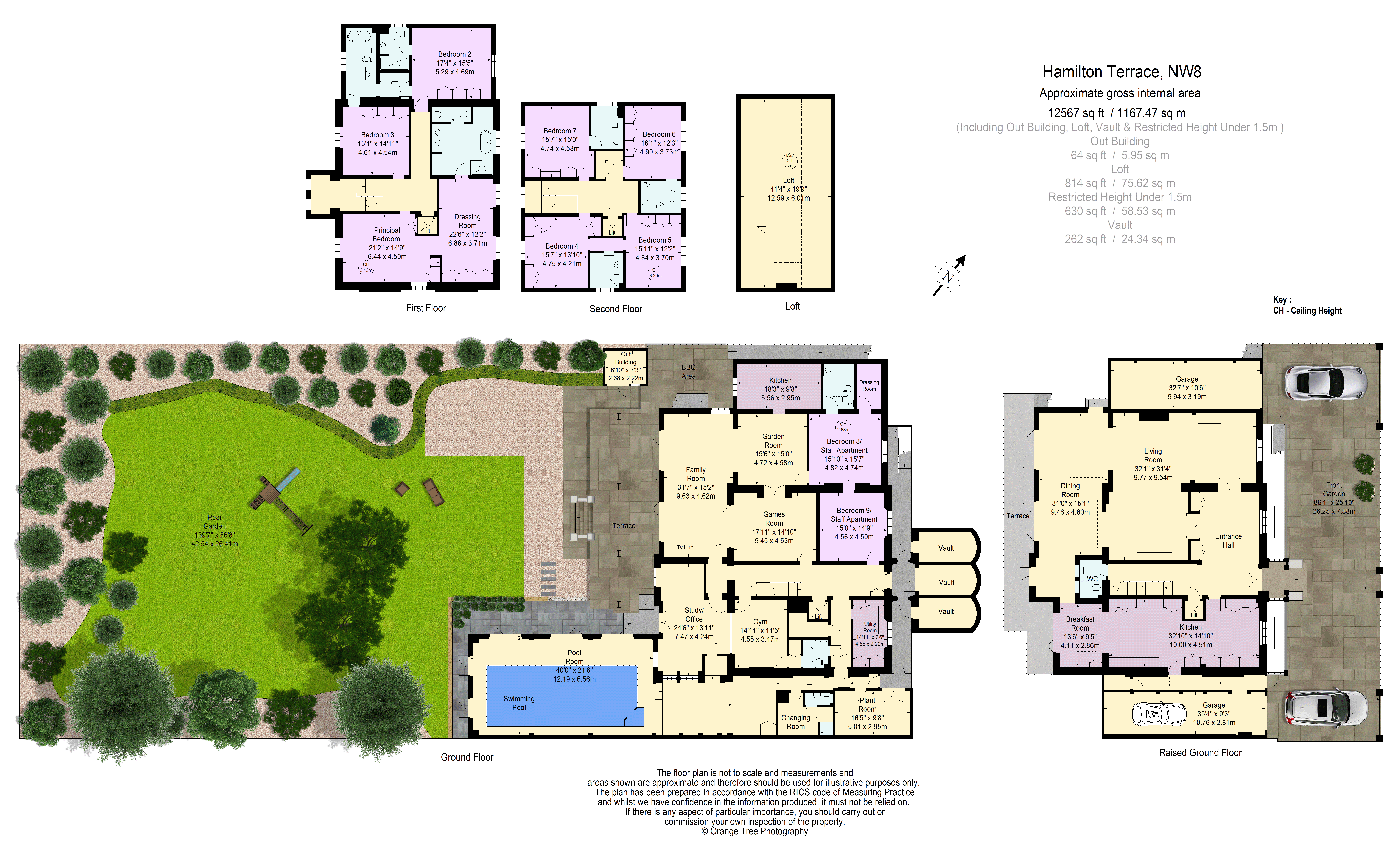 Principal bedroom with en suite dressing room and bathroom 6 further bedrooms 4 further bathrooms 32 ft reception room Dining room Large kitchen/breakfast room Family room Garden room Study Gym Second kitchen Indoor swimming pool/leisure area Changing room Separate staff accommodation comprises of 2 bedrooms with en suite shower room Utility room
