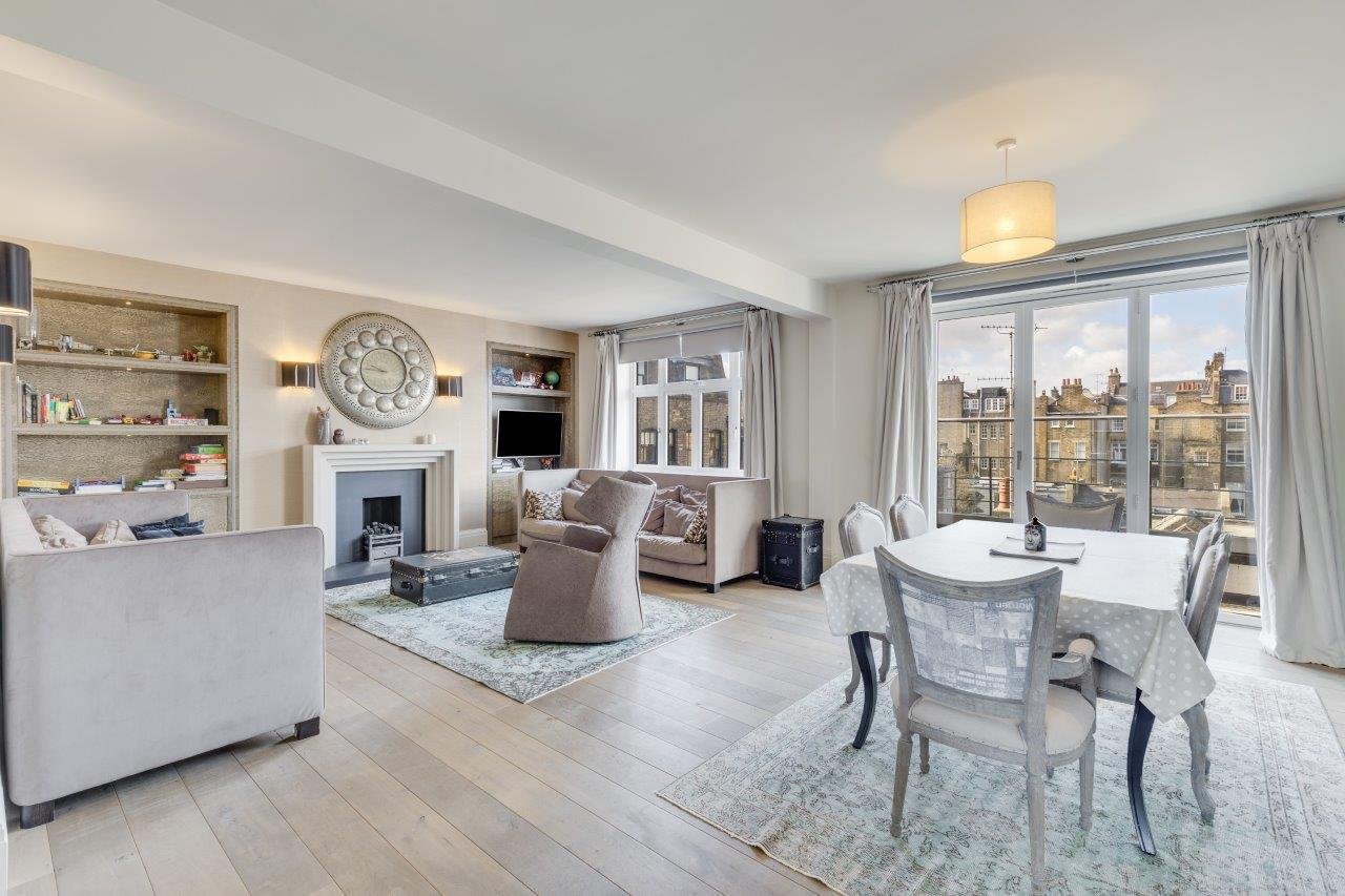 Positioned on the fourth floor with a passenger lift, the property offers well balanced lateral accommodation with a separate reception room and dining area, a fully fitted kitchen with integrated appliances, and three en-suite bedrooms. The property is presented in excellent condition throughout, with generous ceiling heights, parquet flooring and refined original detailing.