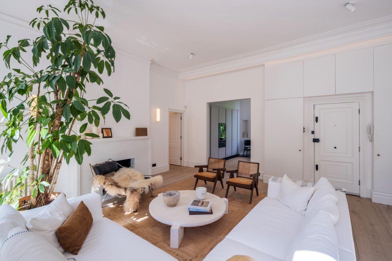 Completed at the end of 2023 following a seven-month renovation, the apartment features a generous reception room with high ceilings, a working fireplace with marble surround and bioethanol system, and direct access to one of two west-facing balconies via French doors with safety glass.