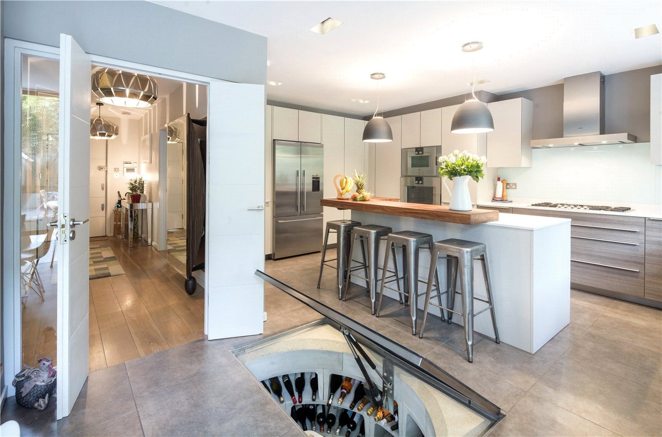 A beautifully presented six bedroom, four bathroom family home (286 sq m/3,080 sq ft), which was subject to an exacting renovation programme and offers excellent entertaining space with a double reception room, modern fully fitted eat-in kitchen, study, excellent built-in storage throughout and guest WC. This house further benefits from having off-street parking for one car, a Poggenpohl kitchen with Gaggenau appliances and a fantastic spiral wine cellar with a 1000 bottle capacity, plus patio garden to the rear.