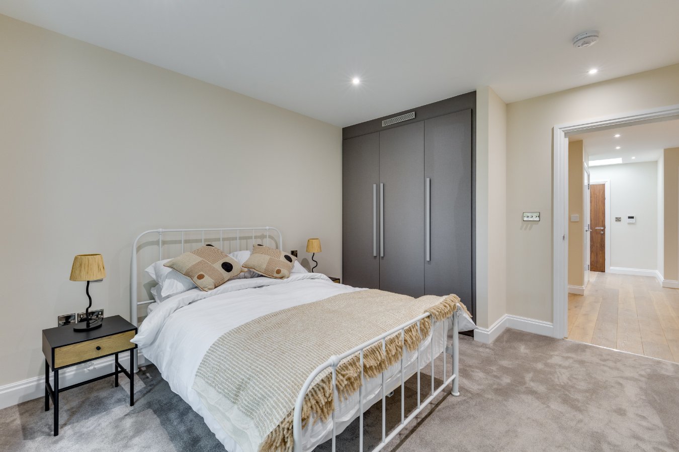 The modern kitchen is fitted with sleek cabinetry, stone worktops and integrated appliances. There are three well-proportioned bedrooms, including a principal bedroom with en-suite shower room and access to a private courtyard, while the remaining two bedrooms are served by a contemporary family bathroom.